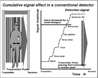 Figure 2 shows how signals from harmless objects are processed by a conventional single zone detector. Pulsed magnetic fields produced by a transmitter (left panel) pass through the person being screened to the receiver panel. As a pulse passes through a metal object it causes eddy currents to be induced in its surface. Once the pulse passes beyond the object its field strength decreases and the eddy currents in the metal start to decay. As the currents decay they generate a low intensity magnetic field. This field is detected by the receiver coils and processed into an electronic signal. The size of the signal from a particular object is determined by its size, shape, surface area, its orientation with respect to the primary magnetic flux, the type of metal and the speed it passes through the detector.