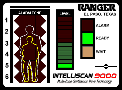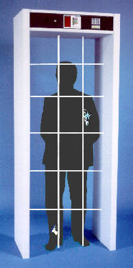Eighteen zones of detection allow the exact location of concealed weapons to be pinpointed. A display shows if a weapon is located on the left, right or center of the person being screened and if it is at ankle, knee, waist, chest or head height. If more than one weapon is being carried each is detected and its location shown. During an ensuing manual search, security personnel can immediately target the object, or objects, that created the alarm(s.) The six zone model functions identically to the eighteen zone equipment but simply indicates the height of the object above ground level. The two zone unit has an upper detection region and a floor zone with fully adjustable sensitivity. The display indicates if an alarm occurred at foot level or in the upper regions of the detector. The importance of adjustable floor zone sensitivity is discussed latter.